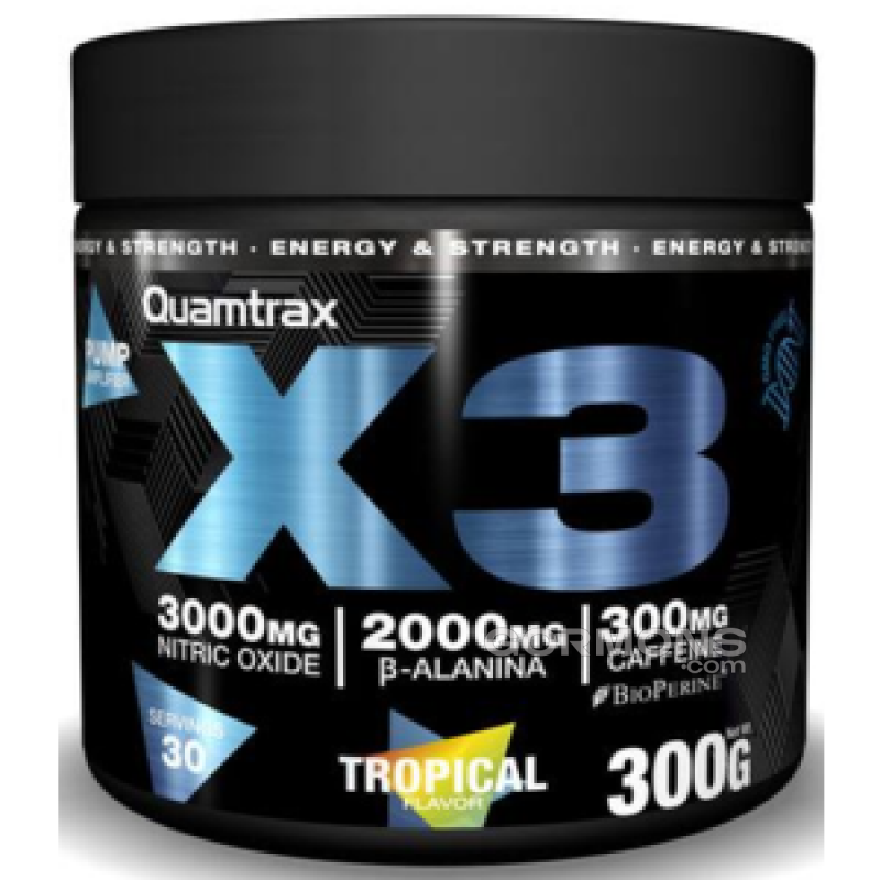 Quamtrax X3 відноситься до тієї ж лінійки, що і HIT, але відноситься до категорії засобів для прийому перед тренуванням і завдяки широкому спектру активних інгредієнтів, які він містить, пропонує комплексний та ефективний підхід як і передтренувальний комплекс теж. Цей зовсім новий продукт містить β-аланін для підтримки працездатності, 2 г цитруліну для покращення потовиділення та один грам аргініну, холіну та таурину.